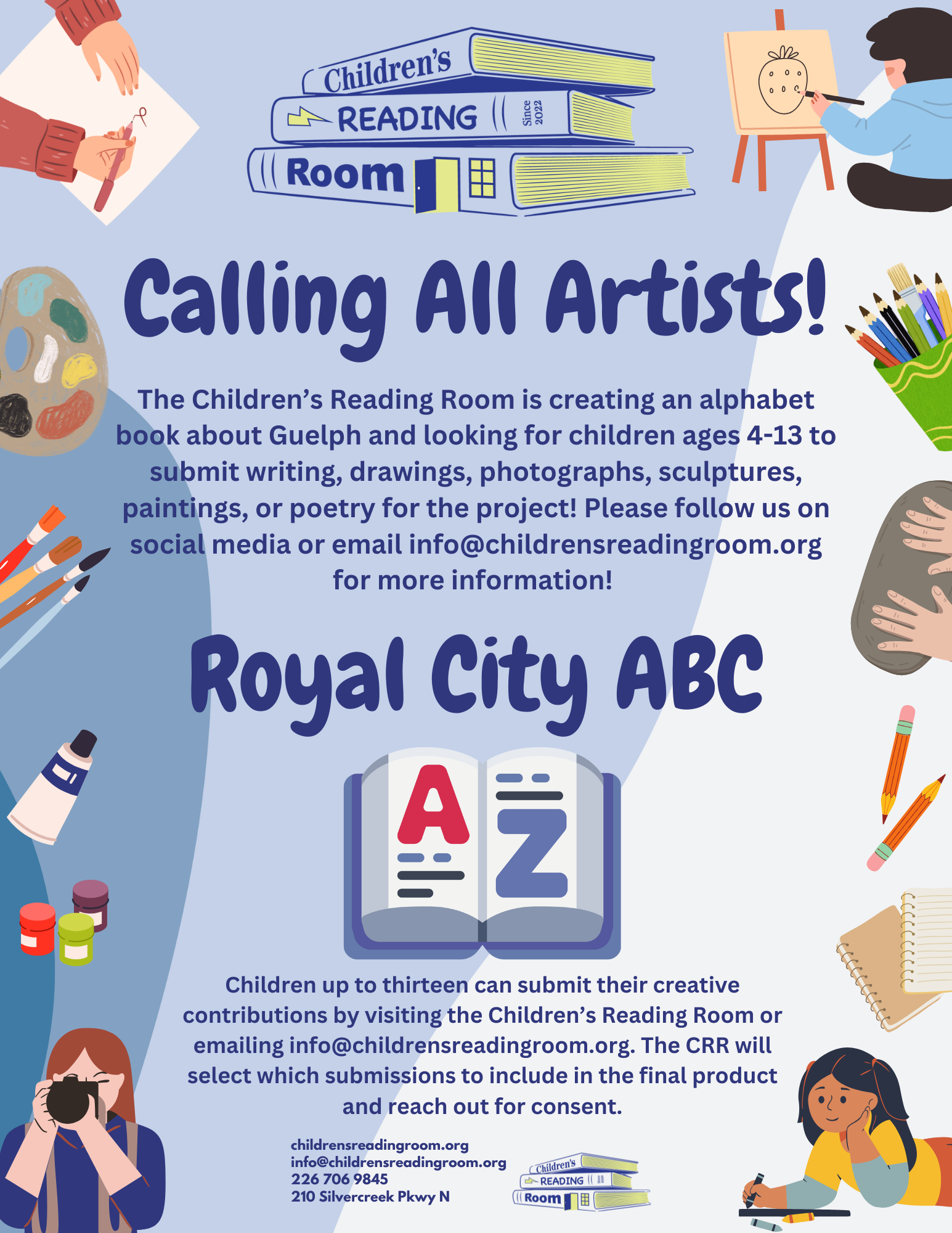 Calling all artists! Join us for an evening of creativity to showcase your interpretation of our vibrant city, with a chance to have your work featured in our upcoming book, Royal City ABC!