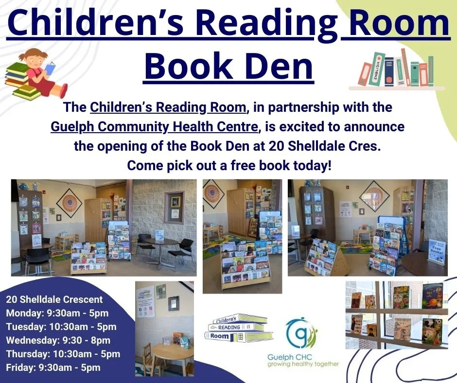 The CRR Book Den at the Guelph Community Health Centre at Shelldale has been a tremendous success! We are receiving excellent feedback from families who visit, and we are continuously learning new ways to enhance the experience so that even more families can benefit from this free resource.